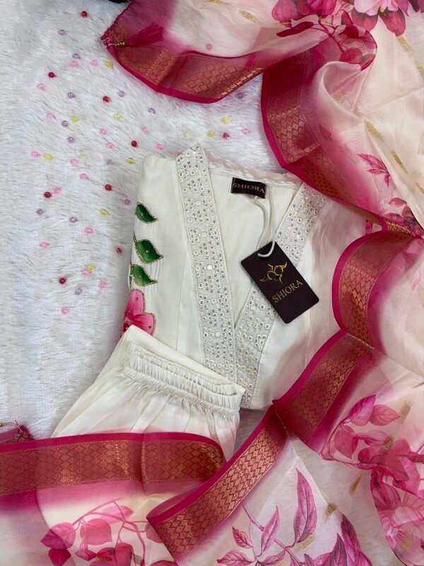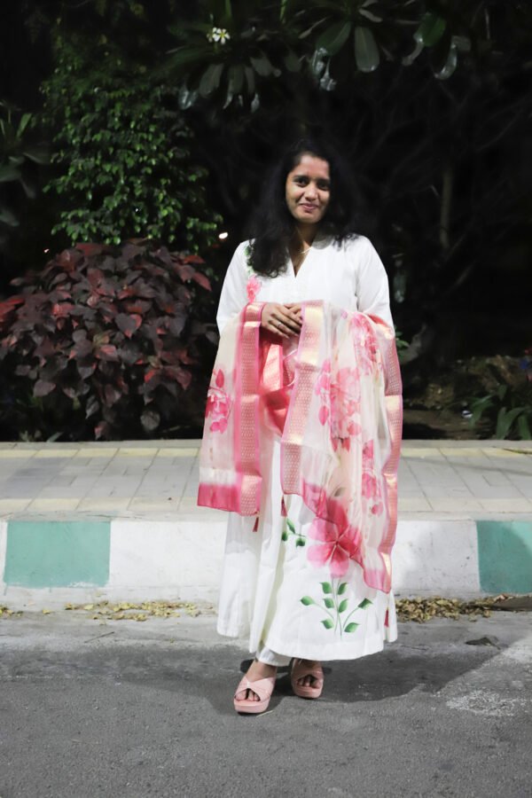 - Color: White Kurti & Pant | Pink & Cream Floral Dupatta