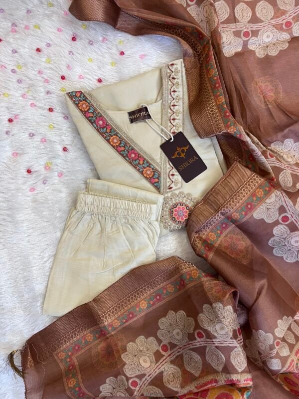 - Color: Cream Kurti & Bottom | Brown Dupatta